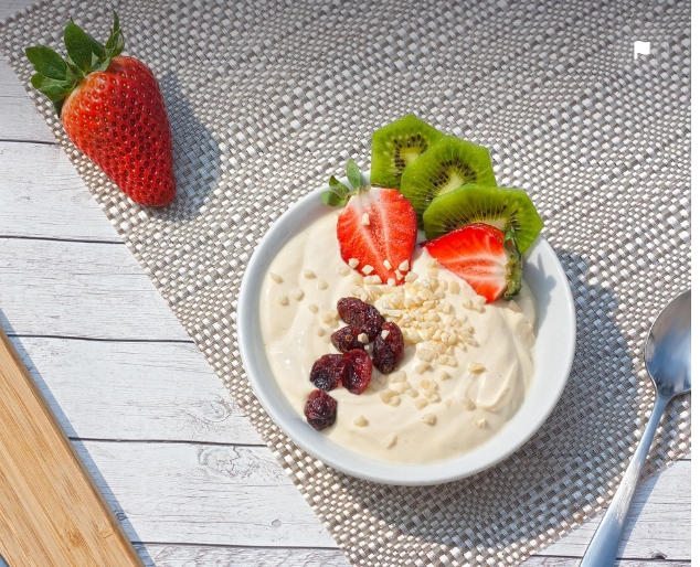 그릭 요거트는 단백질 함량이 높고, 프로바이오틱스(유산균)가 풍부하여 장 건강과 면역력 강화에 도움을 줍니다.